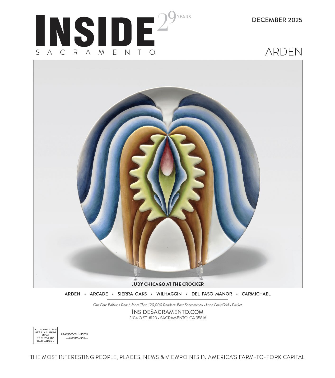This piece by Judy Chicago (American, born 1939) is part of the exhibition, “Making Moves: A Collection of Feminisms,” at Crocker Art Museum. Anchored by two works by Frida Kahlo, including the iconic “Self-Portrait with Loose Hair” (1947), the exhibition brings together more than 70 works that reflect the breadth of feminist thought and women’s experiences across two centuries. Shown: “Test Plate for Hatshepsut,” from The Dinner Party, 1977–1978, ceramic, 13 5/8 inches, Crocker Art Museum, gift of Simon K. Chiu. The exhibition runs through May 3, 2026. Visit crockerart.org.
