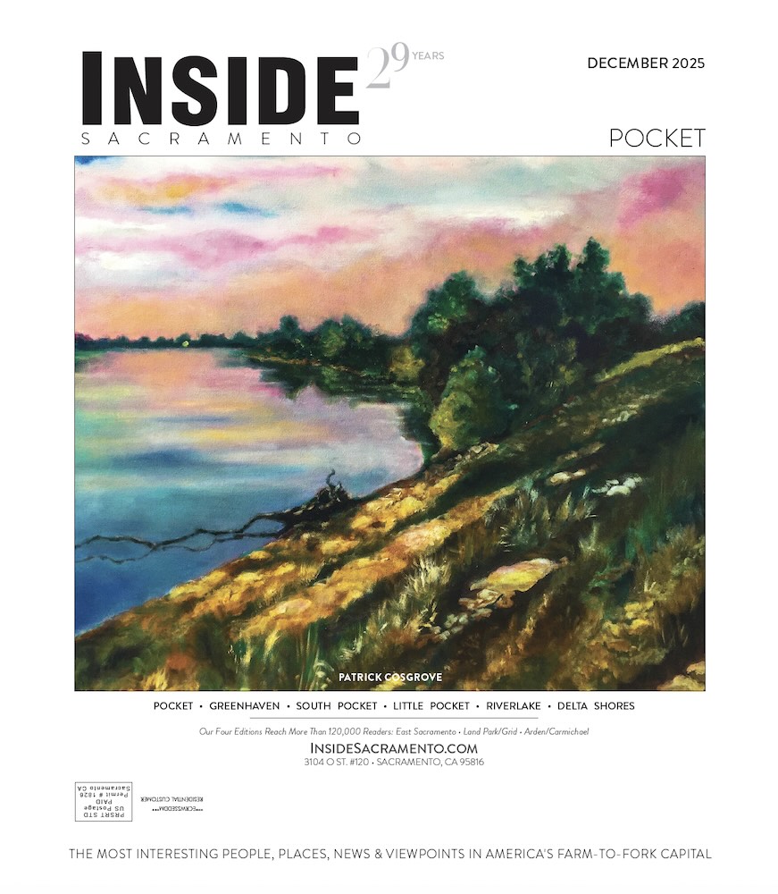 This is Patrick Cosgrove’s eighth cover for Inside Sacramento. His work is in private collections and regularly auctioned for KVIE, Pence Gallery and YoloArts fundraisers. His oil paintings and photographs reflect a search for rhythm and energy within the natural beauty of the Northern California landscape. Shown: “Sacramento River Levee, Dusk.” Prints and other original art are available for sale. Contact Patrickcosgroveart@gmail.com or visit cosgroveart.com.
