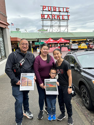 Michael, Janie and Zachary Fong with Kamm Kojima visiting Pike Place Market in Seattle, Washington.