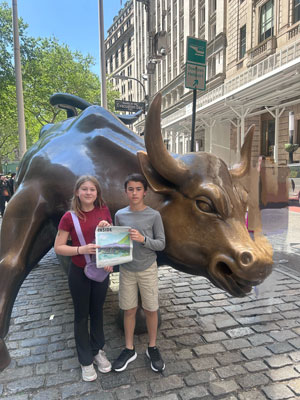 Dudley and Clover Wade with Wall Street’s Charging Bull in New York City.