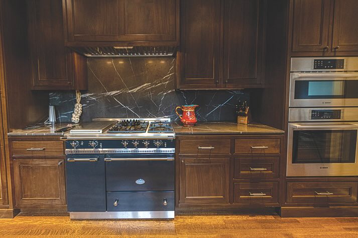 New interior finishes are warm, rich and masculine. Cabinetry is dark walnut, harvested from a tree Popp sourced in Woodland. High-end appliances are paired with dark marble counters and backsplashes.