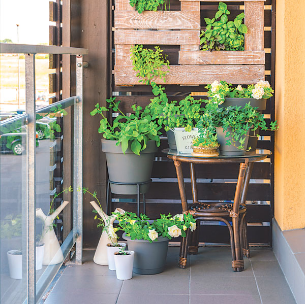 Instead of allowing plant sprawl that gobbles up valuable space, guide plants skyward. Use trellising, staking and training. Hang plants in pots and planters.